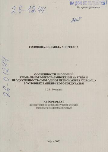 Головина Л. А., Особенности биологии, клональное микроразмножение in vitro и продуктивность смородины черной (Ribes nigrum L.) в условиях Башкирского Предуралья: автореферат диссертации — 2025 г.