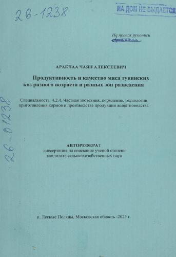 Аракчаа Ч. А., Продуктивность и качество мяса тувинских коз разного возраста и разных зон разведения: автореферат диссертации — 2025 г.